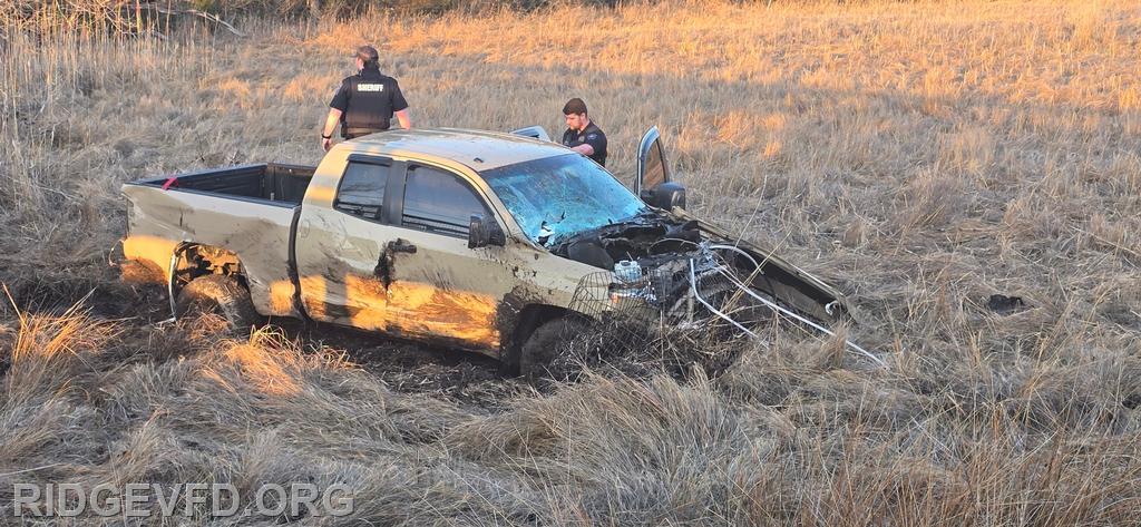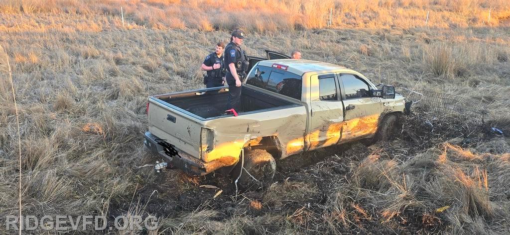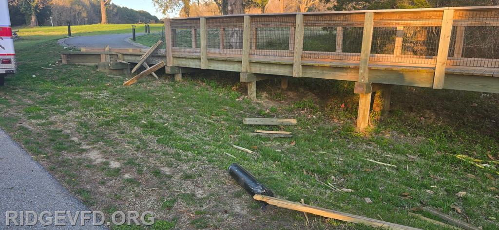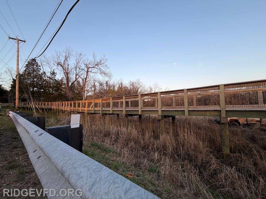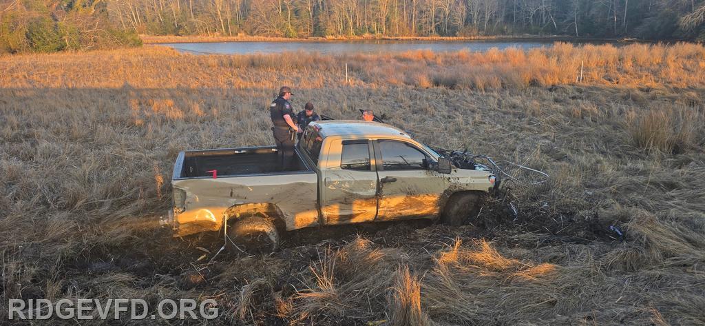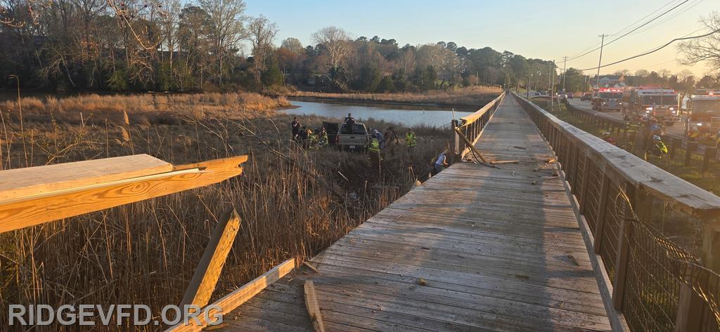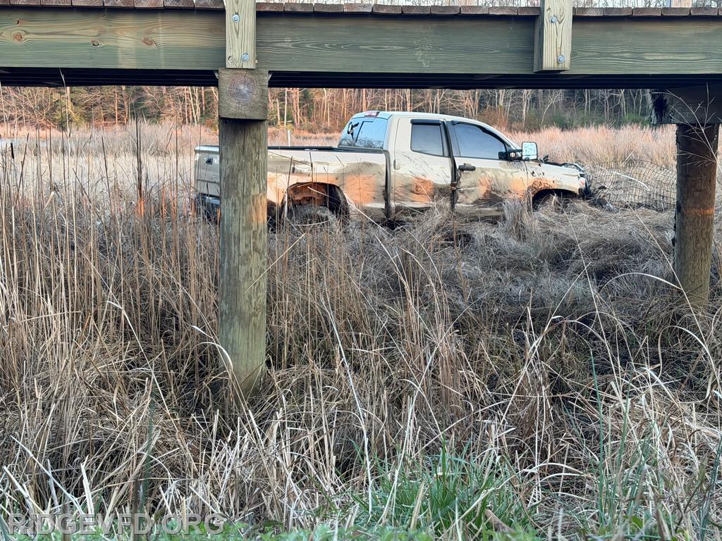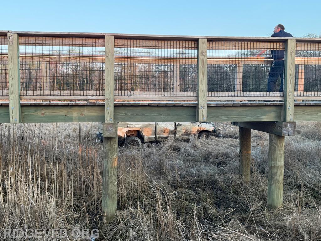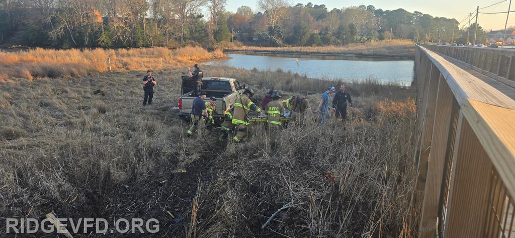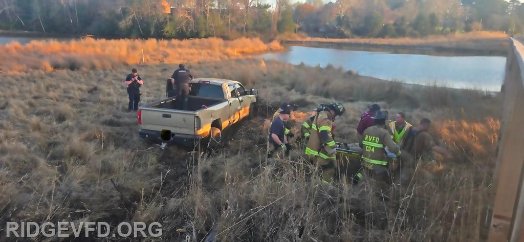 Engine 141 confirmed the vehicle was off the roadway on the opposite side of a pedestrian foot bridge, located in a swamp area. Squad 4 joined Engine 141 in gaining access to the patient, providing initial care, and safely removing the individual from the swamp using a stokes basket.