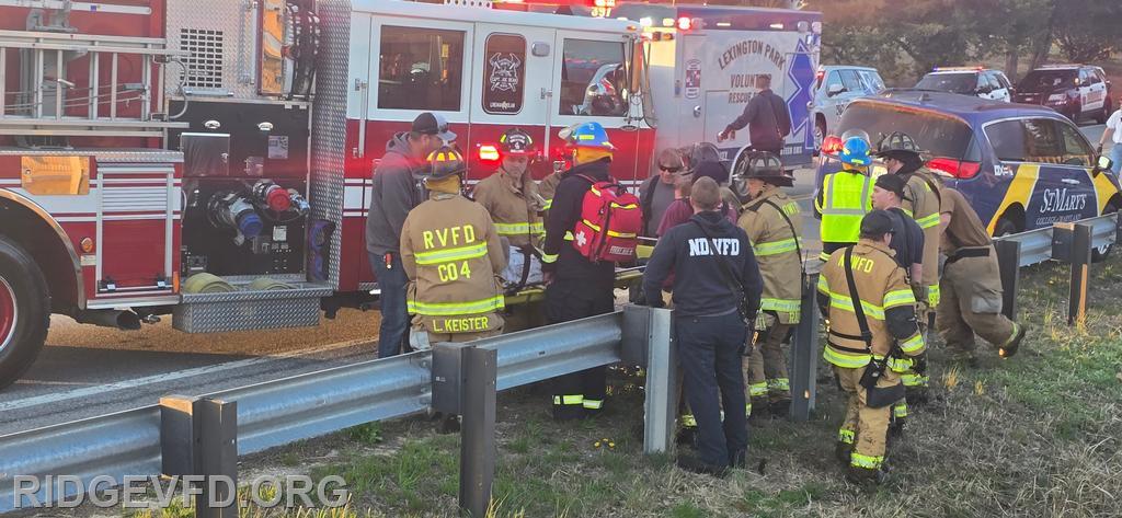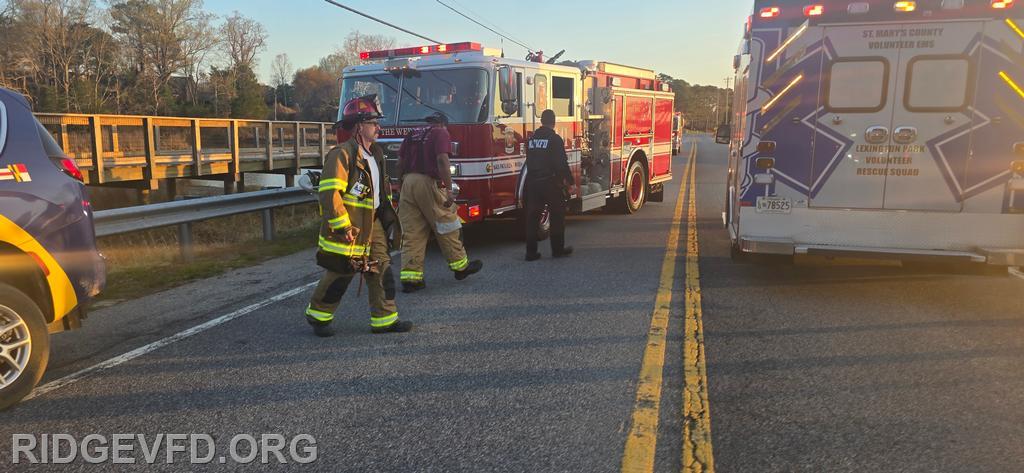 | 4-01 Box, 6:40 p.m.- Squad 4 and Engine 43 were dispatched to the area of 17171 Point Lookout Road in St. Mary’s City for a reported motor vehicle accident with injuries. Chief 39B arrived shortly after and found a vehicle off the roadway in the water. One patient was identified with a possible broken leg.